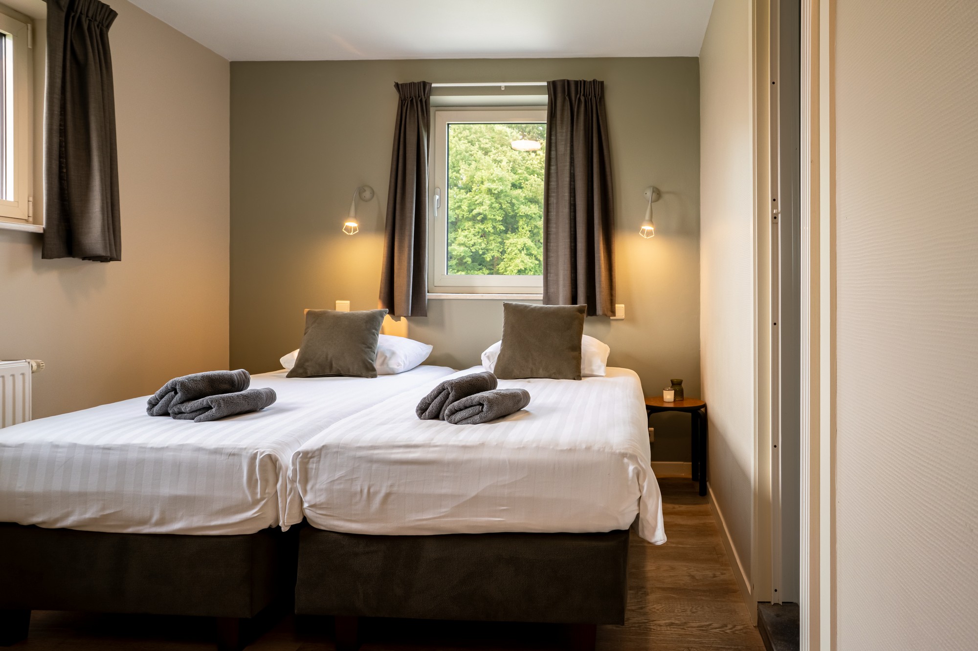 - 8 slaapkamers met 2 x eenpersoons boxspringbed 90 x 200 cm